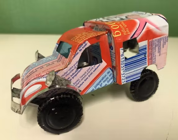 Citroën 3CV är handgjord av insamlade metallburkar, dvs metallskräp och därför blir varje bil unik!